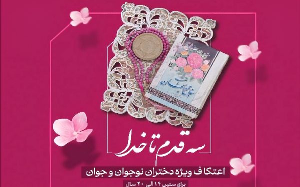 اعتکاف سه قدم تا خدا ویژه دختران نوجوان و جوان، فرصتی ناب برای خودسازی، خلوت با خدا و تجربه عمیق بندگی است. این اعتکاف با رویکردی تربیتی و متناسب با نیاز نسل نوجوان و جوان، برای رده سنی ۱۴ تا ۲۰ سال برگزار میشود.