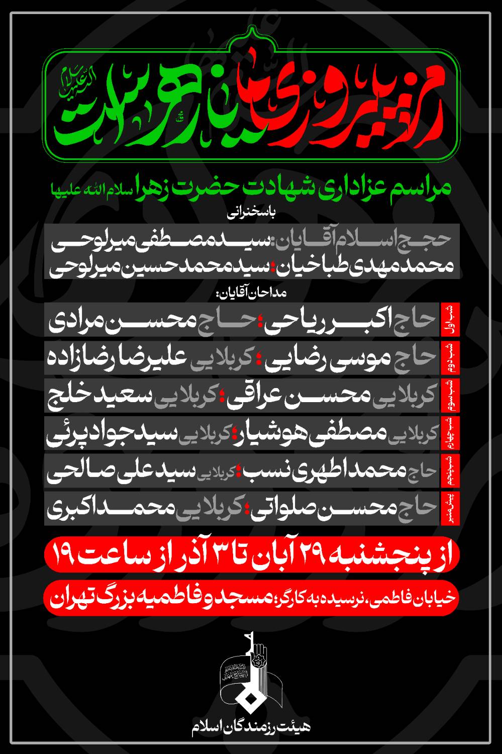 مراسم عزاداری شهادت حضرت زهرا سلاماللهعلیها امسال با حضور جمعی از سخنرانان برجسته و ذاکران اهلبیت، از ۲۹ آبان تا ۳ آذر هر شب از ساعت ۱۹ در مسجد و فاطمیه بزرگ تهران برگزار میشود. این مراسم معنوی توسط هیئت رزمندگان اسلام تدارک دیده شده است و مشتاقان اهلبیت میتوانند در فضای روحانی و نورانی ایام فاطمیه حضور پیدا کنند.